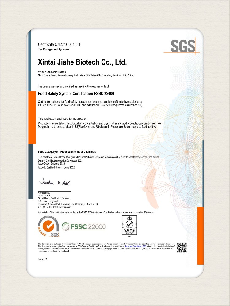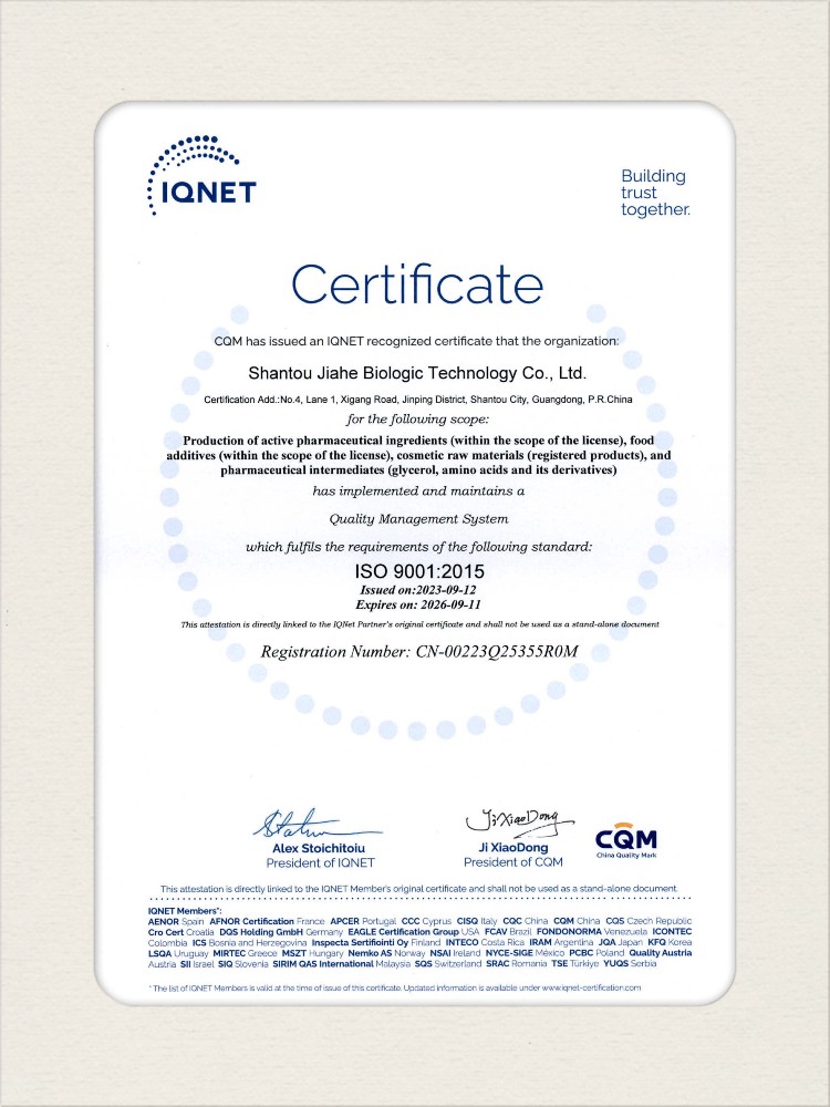 汕頭佳禾生物科技有限公司是一家致力于氨基酸及其衍生物研發(fā)、生產(chǎn)和銷售的國家高新技術(shù)企業(yè),先后通過了國家藥品GMP認(rèn)證,ISO9001質(zhì)量體系認(rèn)證、ISO14001環(huán)境管理體系認(rèn)證。目前,公司擁有“廣東省專精特新中小企業(yè)”、“廣東省氨基酸產(chǎn)品工程技術(shù)研究中心”、“汕頭市生物發(fā)酵工程技術(shù)研究開發(fā)中心”、“汕頭市知識產(chǎn)權(quán)優(yōu)勢企業(yè)”、“多項(xiàng)國家發(fā)明專利”、“廣東省守合同重信用企業(yè)”等多項(xiàng)資質(zhì)和榮譽(yù),旗下“佳禾牌”系列產(chǎn)品已成為原料藥行業(yè)知名品牌。 新泰市佳禾生物科技有限公司成立于2012年8月,注冊資金2億元,公司位于山東泰安新泰市新汶工業(yè)園區(qū),是國 家級高新技術(shù)企業(yè)、山東省“專精特新”企業(yè)、山東省制造業(yè)單項(xiàng)冠軍企業(yè)、泰安市科技型中小企業(yè)、泰安市農(nóng)業(yè)產(chǎn)業(yè)化龍頭企業(yè)、中國生物發(fā)酵產(chǎn)業(yè)協(xié)會理事單位。